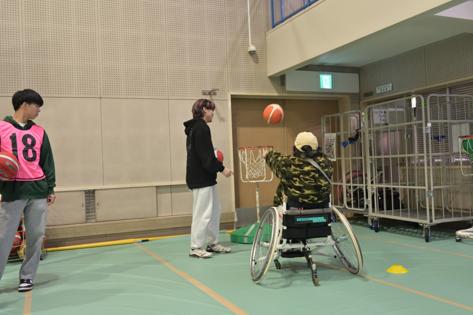 私:「車いすバスケットボール体験やってます。楽しいですよー」
