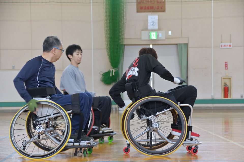 この日は松永製作所の方がデモ車を持参してくれてバスケ車を新調する必要がある選手が試乗しました。今回持参していただいたのはタイヤのサイズが25インチと26インチの2台です。昨年の2月26日に持参していただいたバスケ車から更なる軽量化をしていただいたものです。